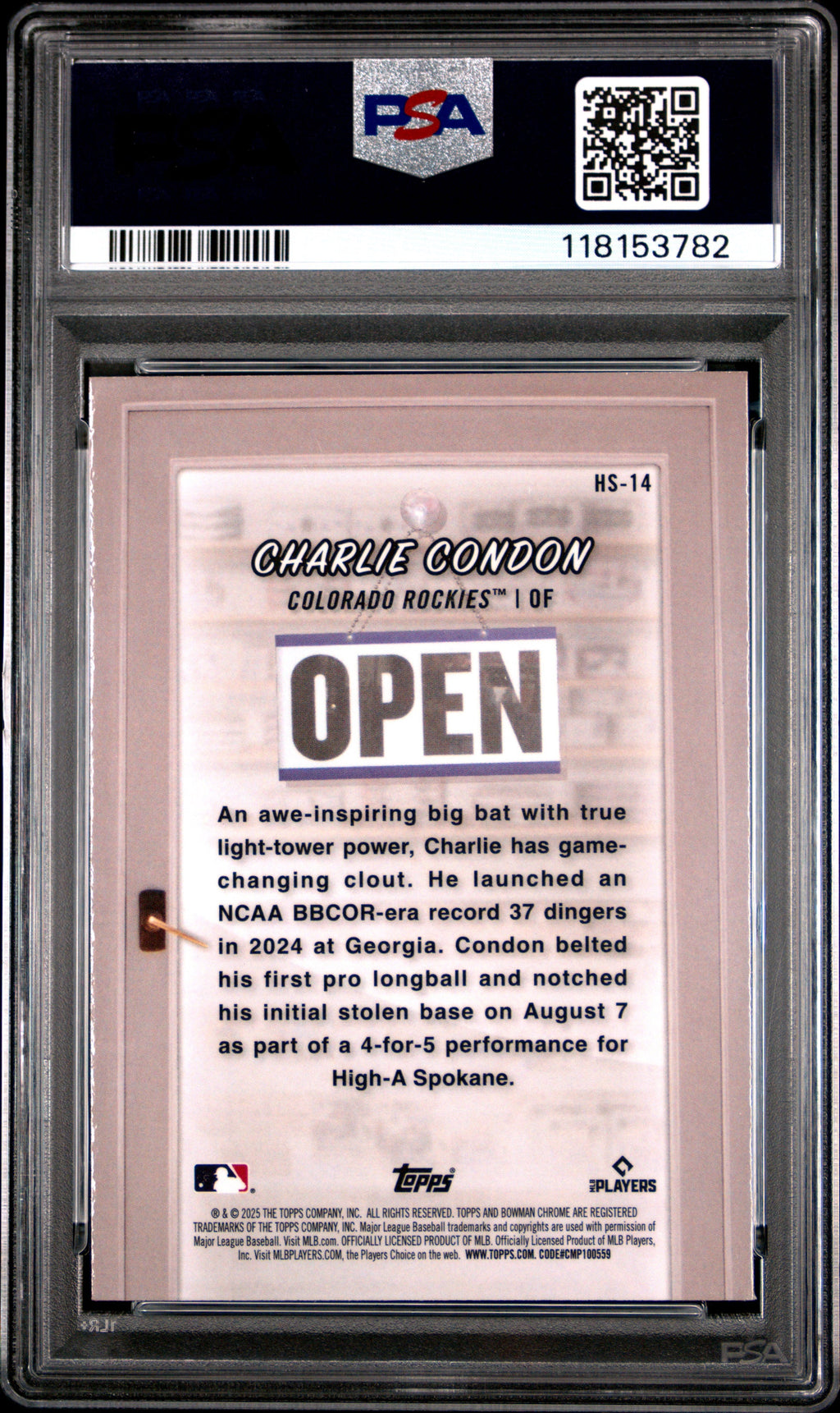 Graded 2025 Topps Bowman Charlie Condon #HS14 Hobby Stars Rookie RC Baseball Card PSA 10 Gem Mint
