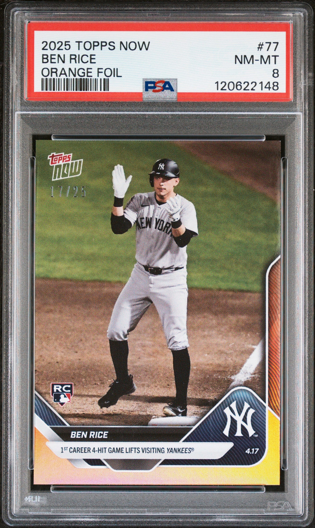 Graded 2025 Topps Now Ben Rice #77 Orange Foil /25 Rookie RC Baseball Card PSA 8 Near Mint