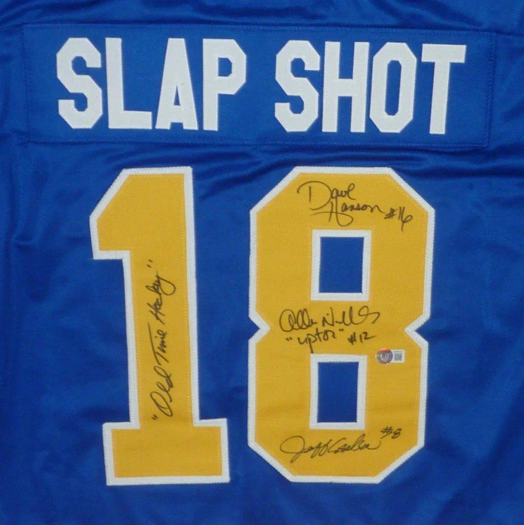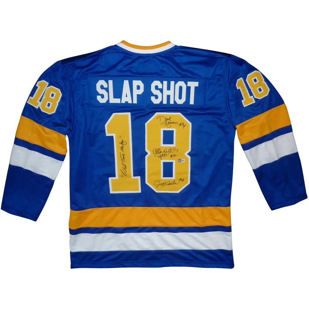 This stitched hockey jersey was hand signed by Slap Shot Actors at a private signing. Signatures include: David Hanson #16, Jeff Carlson #18 and Allan Nicholls who played "Upton". It is accompanied by a Certificate of Authenticity from Beckett. It is a pro-style custom stitched jersey with no Team logos or league markings. A tamper-evident hologram will be affixed to the item. Each signature is witnessed by a member of our staff or comes out of a private signing.