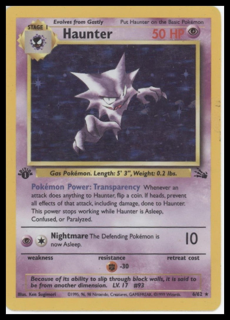 Card Number: 06/62 Category: 183454 Category: Collectible Trading Cards Condition: Lightly played Game: Pokemon Player/Character: Haunter (6) Rarity: Holo Rare Set: Fossil Type: Collectible Card Game Year: 1999