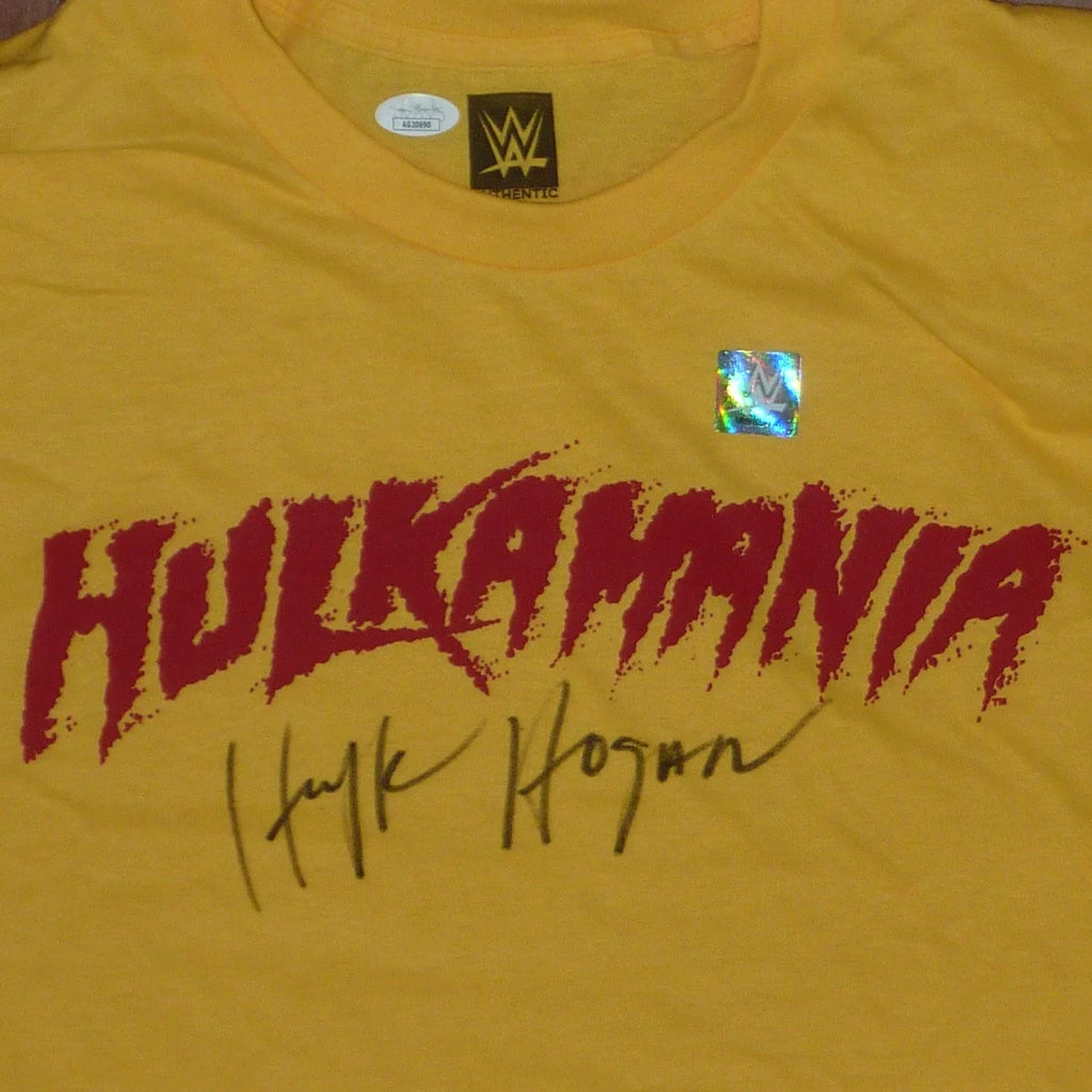 This Hulkamania yellow t-shirt was hand signed by legendary Wrestler Hulk Hogan at a private signing. It is accompanied by a Certificate of Authenticity from JSA. A tamper-evident hologram will be affixed to the item. Each signature is witnessed by a member of our staff or comes out of a private signing.