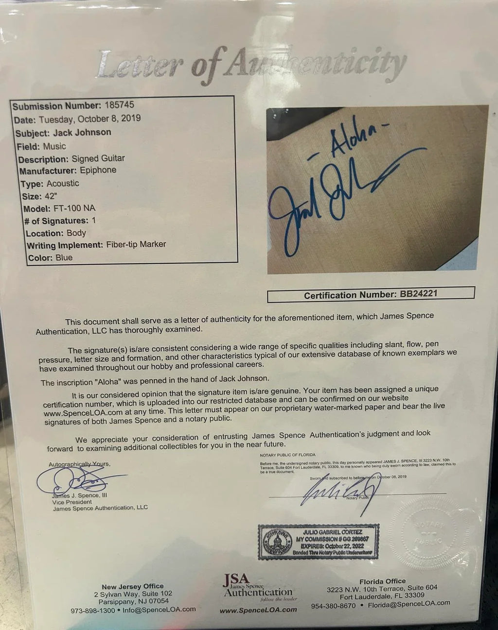 This truly special acoustic guitar is hand-signed by the legendary musician Jack Johnson himself. With its certified autograph from JSA, this guitar is not only a beautiful addition to any collection, but also a piece of music history. Own a piece of the magic with this unique and valuable item!