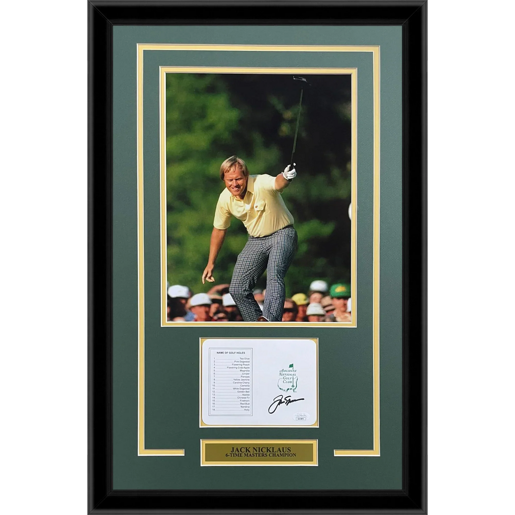 Score a hole-in-one with this Jack Nicklaus Autographed Augusta National Golf Scorecard Deluxe Framed with 1986 Masters 11x14 Photo! A must-have for any golf enthusiast, this framed piece showcases Nicklaus' signature and commemorates his historic 1986 Masters win. With authenticity certified by JSA, this piece is a valuable addition to any collection.