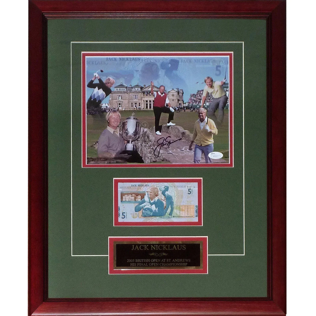 Own a piece of history with this deluxe framed currency piece featuring an autographed RBS 5 Pound Note from the 2005 British Open, signed by the legendary Jack Nicklaus himself! This unique collectible is a must-have for any golf fan with JSA authenticity and makes for a valuable addition to any collection. Each signature is witnessed by a member of our staff or comes out of a private signing.