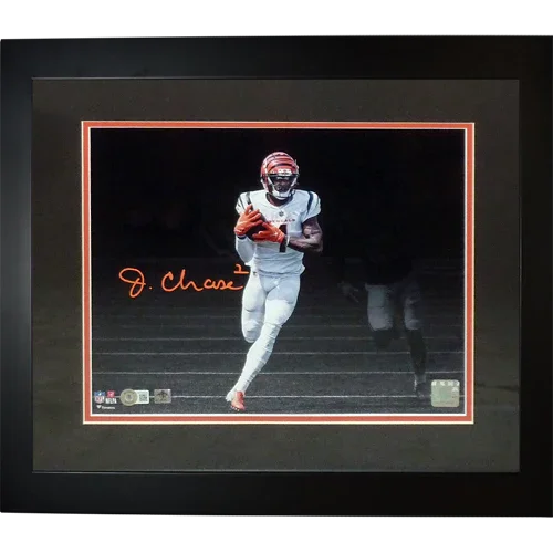 Own a piece of NFL history with this autographed Ja'Marr Chase photo featuring a spotlight image of the Cincinnati Bengals star. This deluxe framed 11x14 photo is authenticated by Beckett, ensuring its value and authenticity. Perfect for any football fan or sports memorabilia collector!