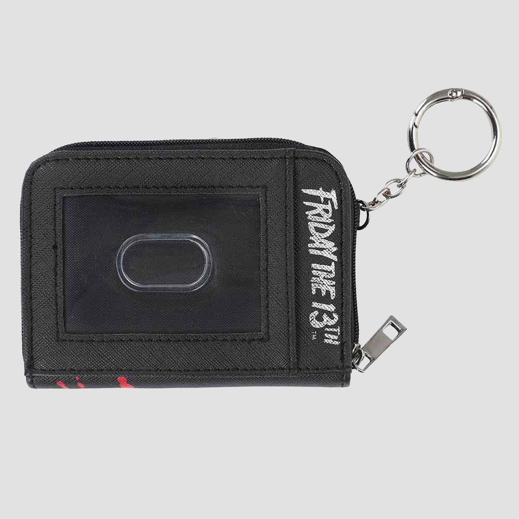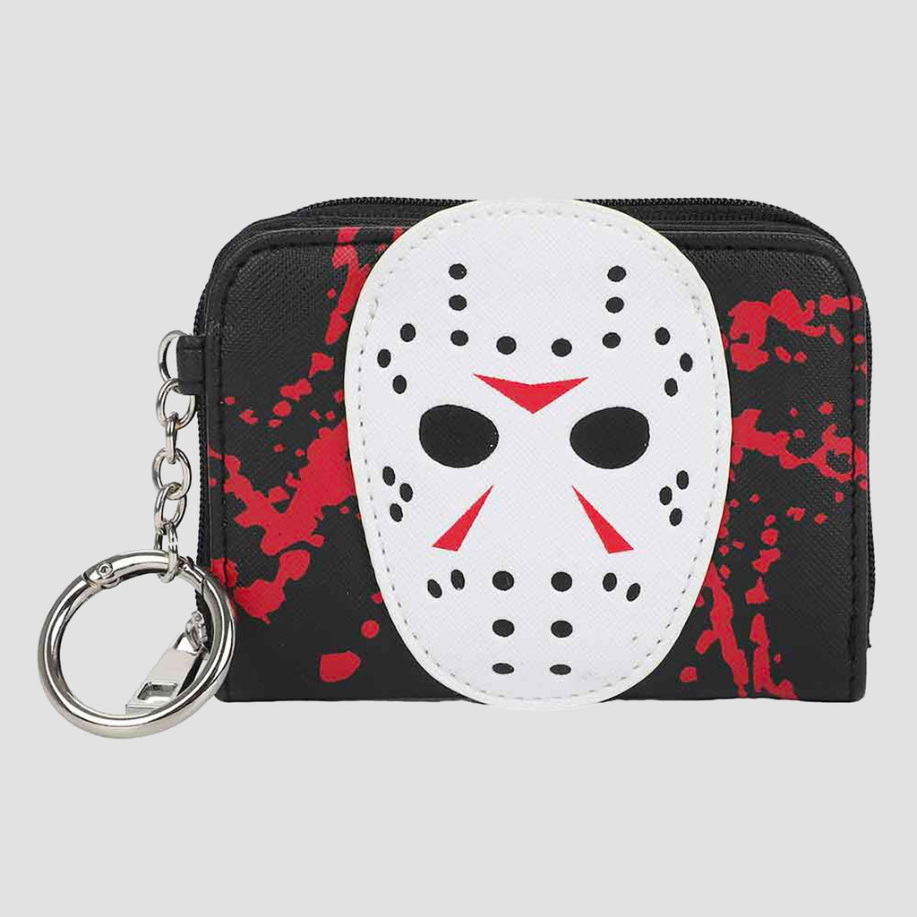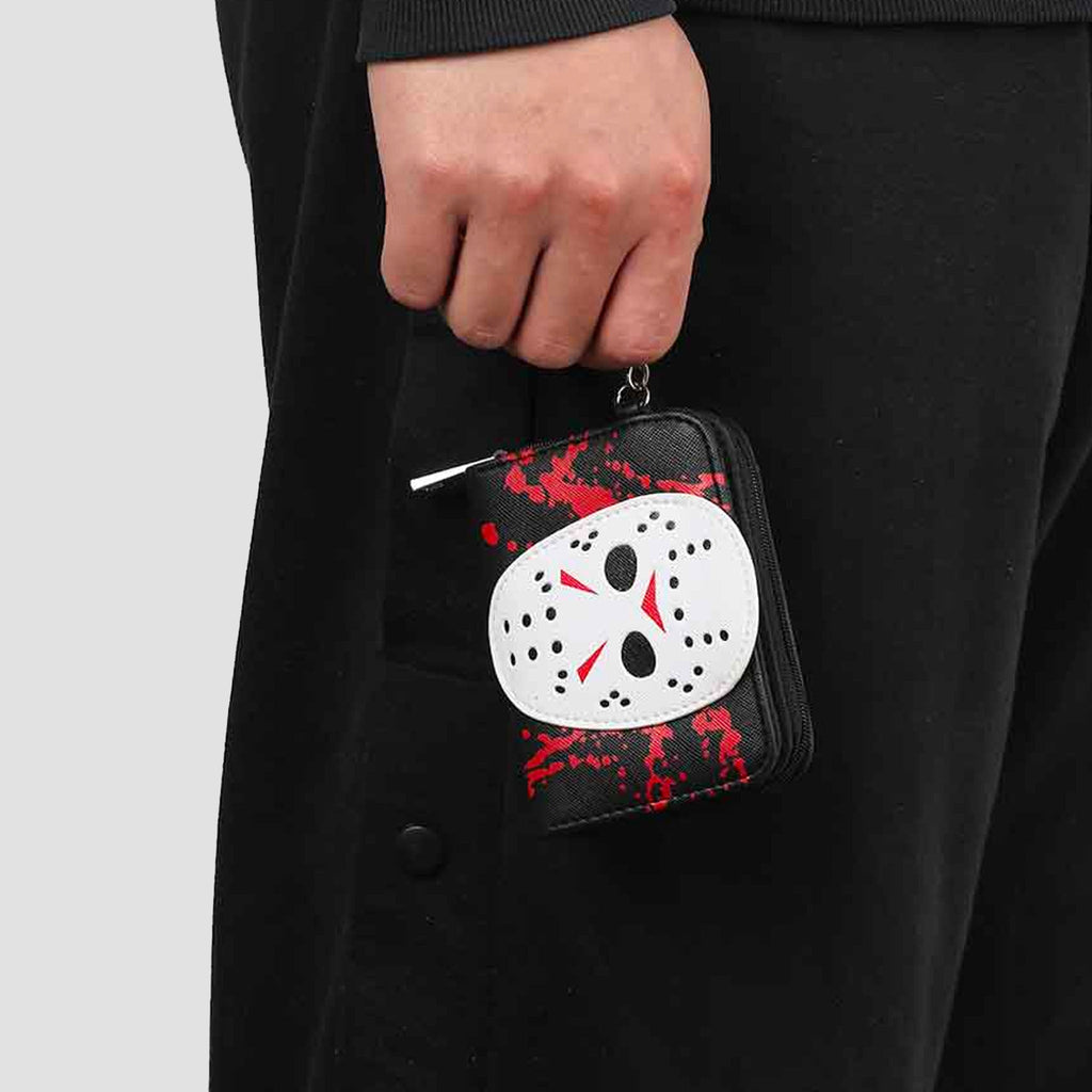 Show off your love of slasher films with mini zip-around wallet featuring Jason Voorhees from the Friday the 13th movies! His white hockey mask dominates the front of this wallet, and the title of the series Friday the 13th is printed on the reverse over a clear ID slot.