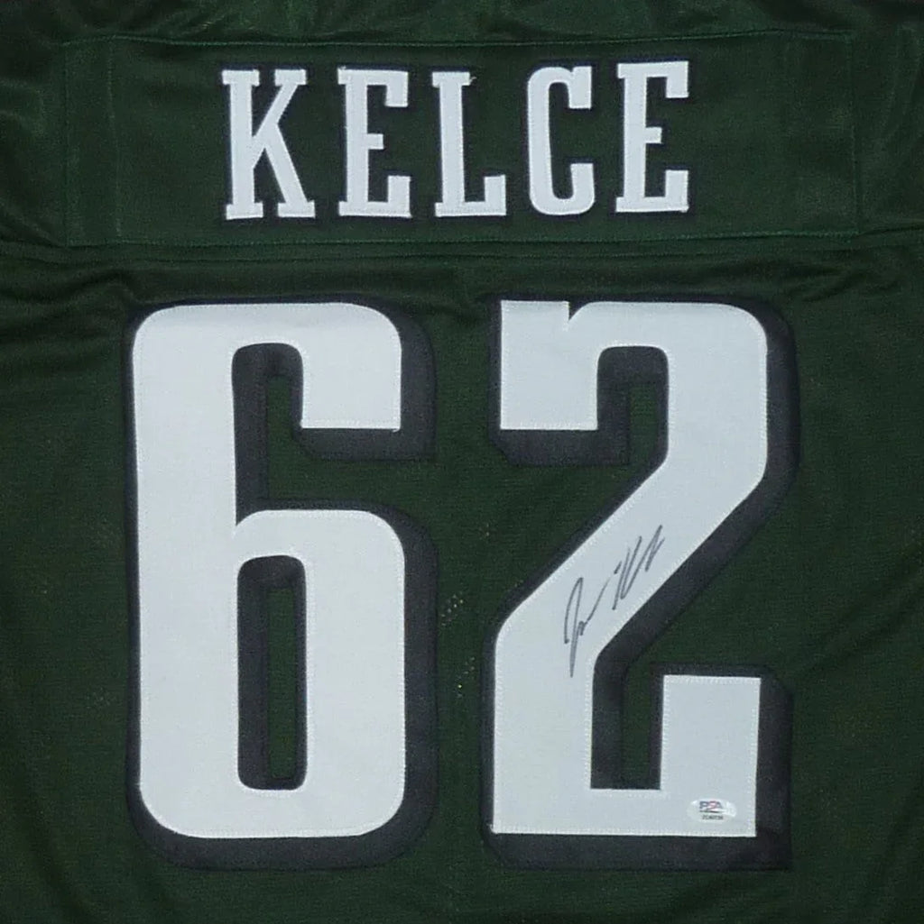 This stitched football jersey was hand signed by Philadelphia Eagles star Jason Kelce at a private signing. It is accompanied by a Certificate of Authenticity from PSA. It is a pro-style custom stitched jersey with no Team logos or league markings. A tamper-evident hologram will be affixed to the item.
