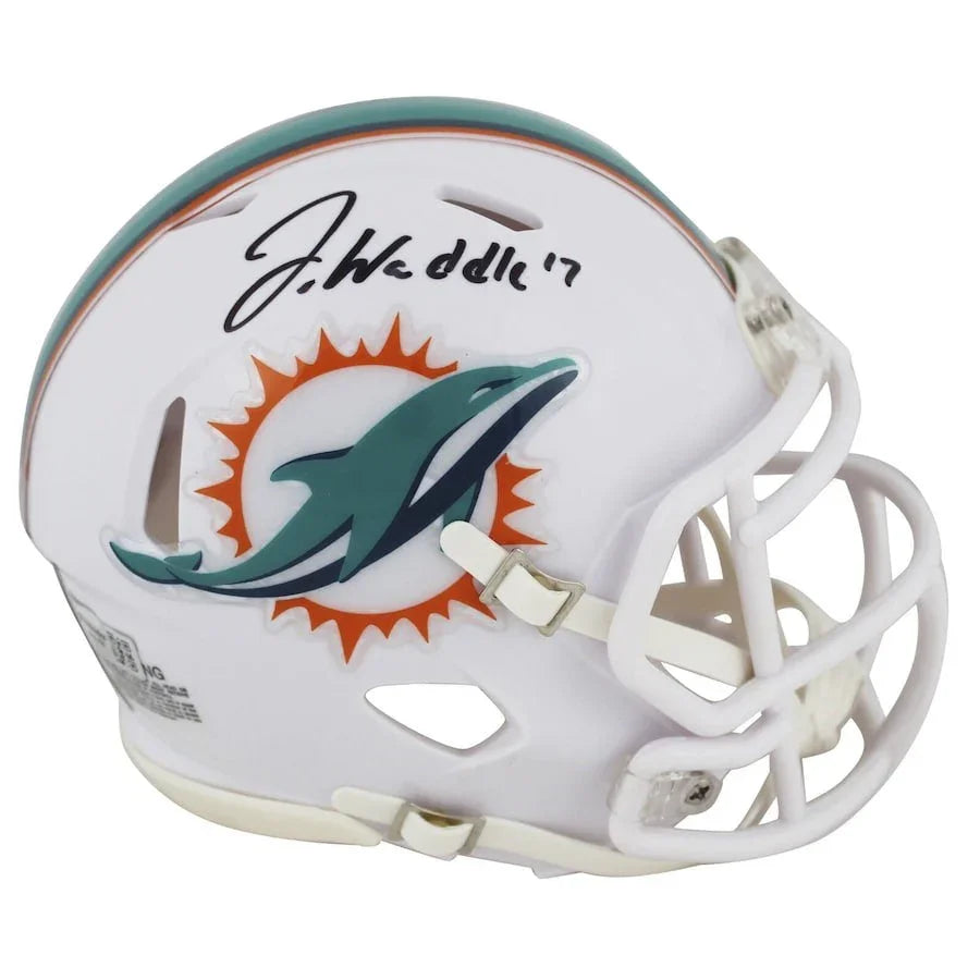 This mini helmet was hand signed by Miami Dolphins star Jaylen Waddle at a private signing. It is accompanied by a Certificate of Authenticity from Fanatics Authentic. A tamper-evident hologram will be affixed to the item. Each signature is witnessed by a member of our staff or comes out of a private signing.