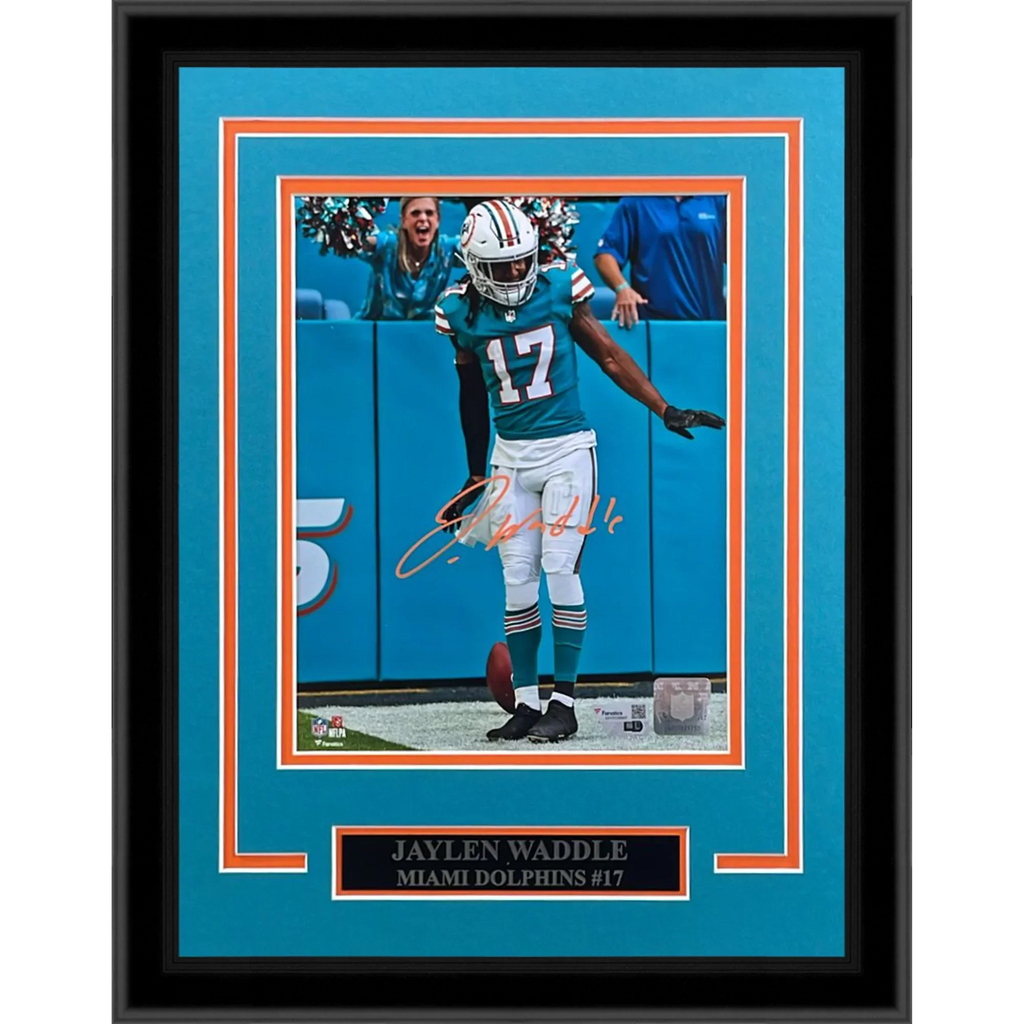Capture the excitement of Jaylen Waddle scoring a touchdown for the Miami Dolphins with this autographed framed 8x10 photo authenticated by Fanatics! Featuring his signature and a commemorative TD celebration moment, this piece is perfect for die-hard fans and collectors alike. Display it proudly and relive the thrill again and again.