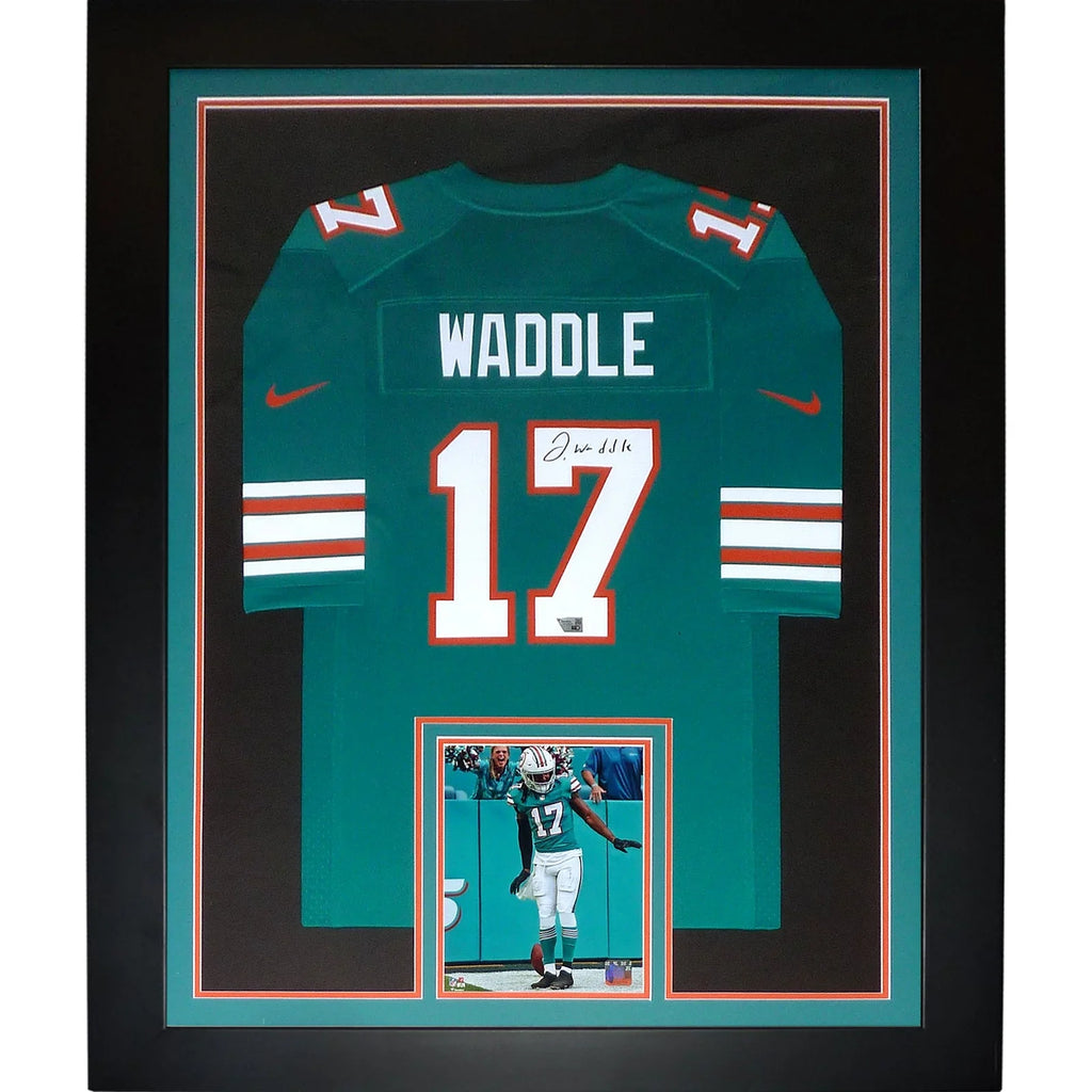 Own a piece of NFL history with this Jaylen Waddle autographed Miami Dolphins Teal Throwback #17 framed jersey. Certified by Fanatics Authentic, this collectible showcases the legendary player's signature and will be a cherished addition to any fan's collection. Show your love for the game and the player who made it great.