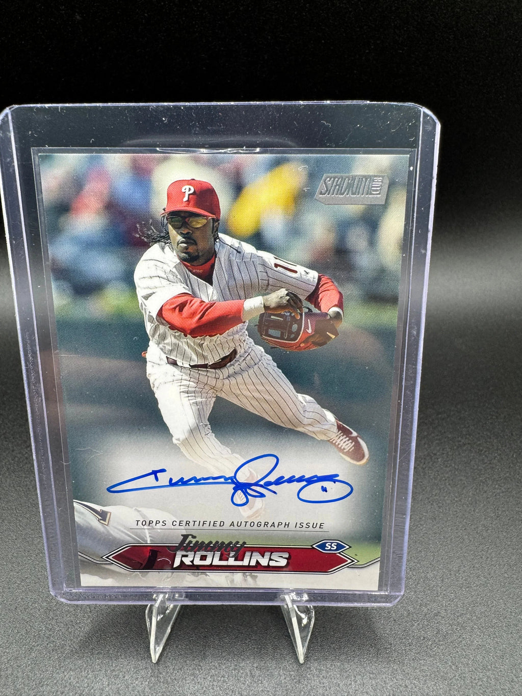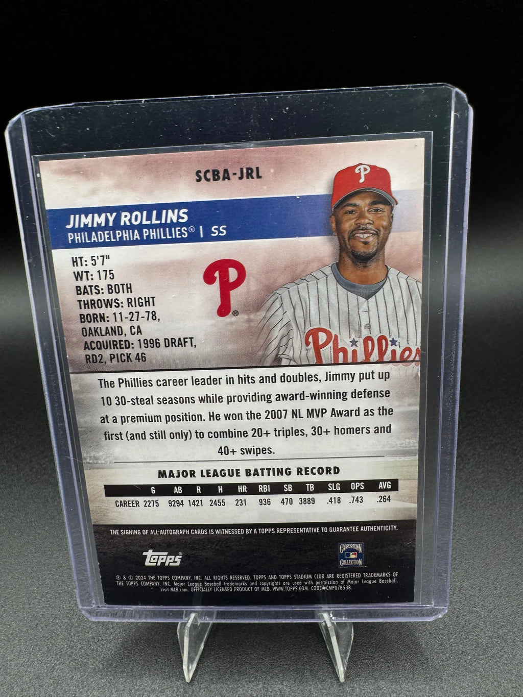 This 2024 Topps Stadium Club Chrome card features an authentic autograph from Jimmy Rollins, a celebrated MLB shortstop known for his dynamic play and leadership. The card’s premium chrome finish highlights Rollins’ signature, making it a prized collectible for serious baseball enthusiasts and autograph collectors alike. Ideal for those seeking a valuable addition to their sports memorabilia, this card combines high-quality design with genuine player authentication.