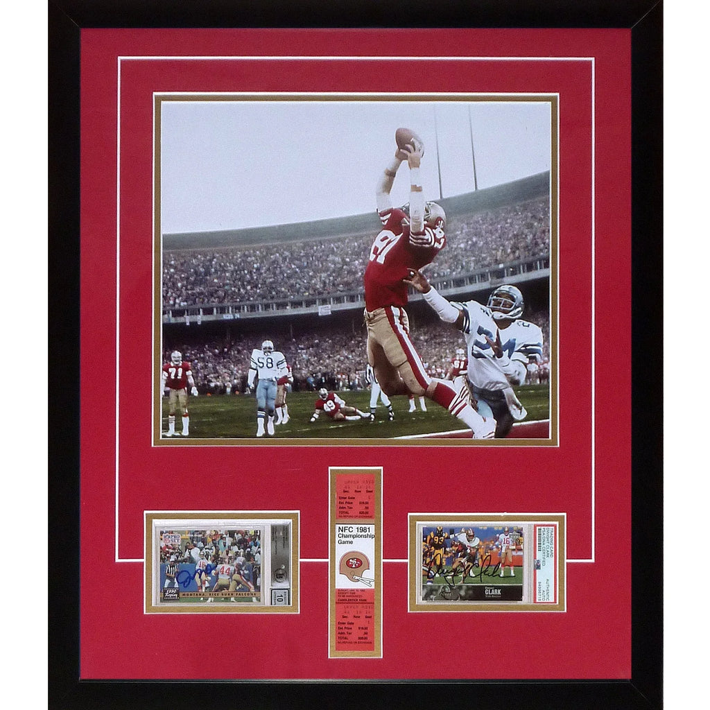 This frame includes autographed and authenticated football cards of San Francisco 49ers players Joe Montana and Dwight Clark. Each card is encapsulated by Beckett. We have professionally framed it underneath an 11x14 of Dwight Clark's "The Catch" along with a replica ticket stub from the game. Each signature is witnessed by a member of our staff or comes out of a private signing.