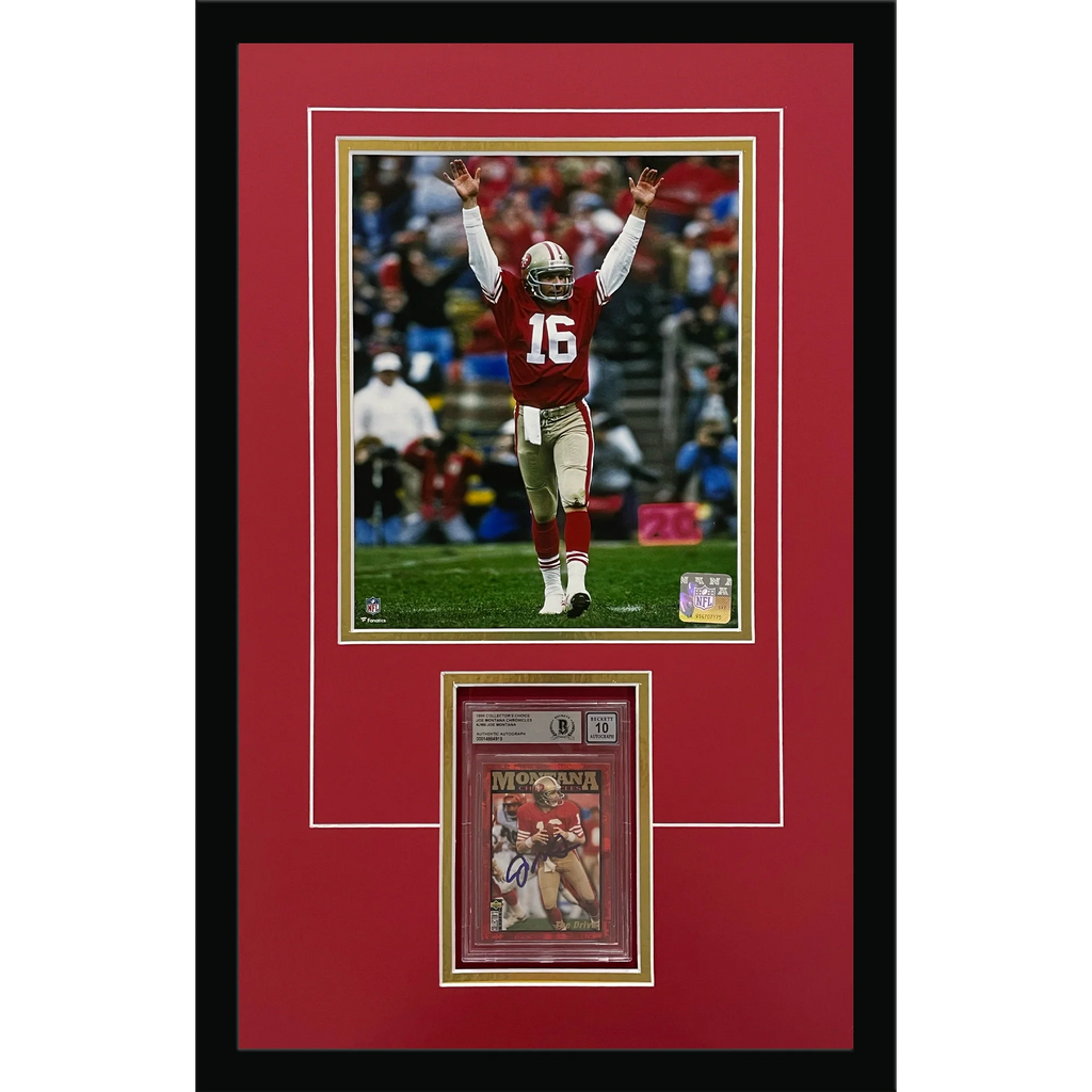 Own a piece of football history with this Joe Montana autographed football card framed with an 8x10 photo of the legendary quarterback in his San Francisco 49ers uniform. Verified by Beckett, this deluxe framed collectible will make a stunning addition to any fan's collection. Don't miss out on this unique opportunity!