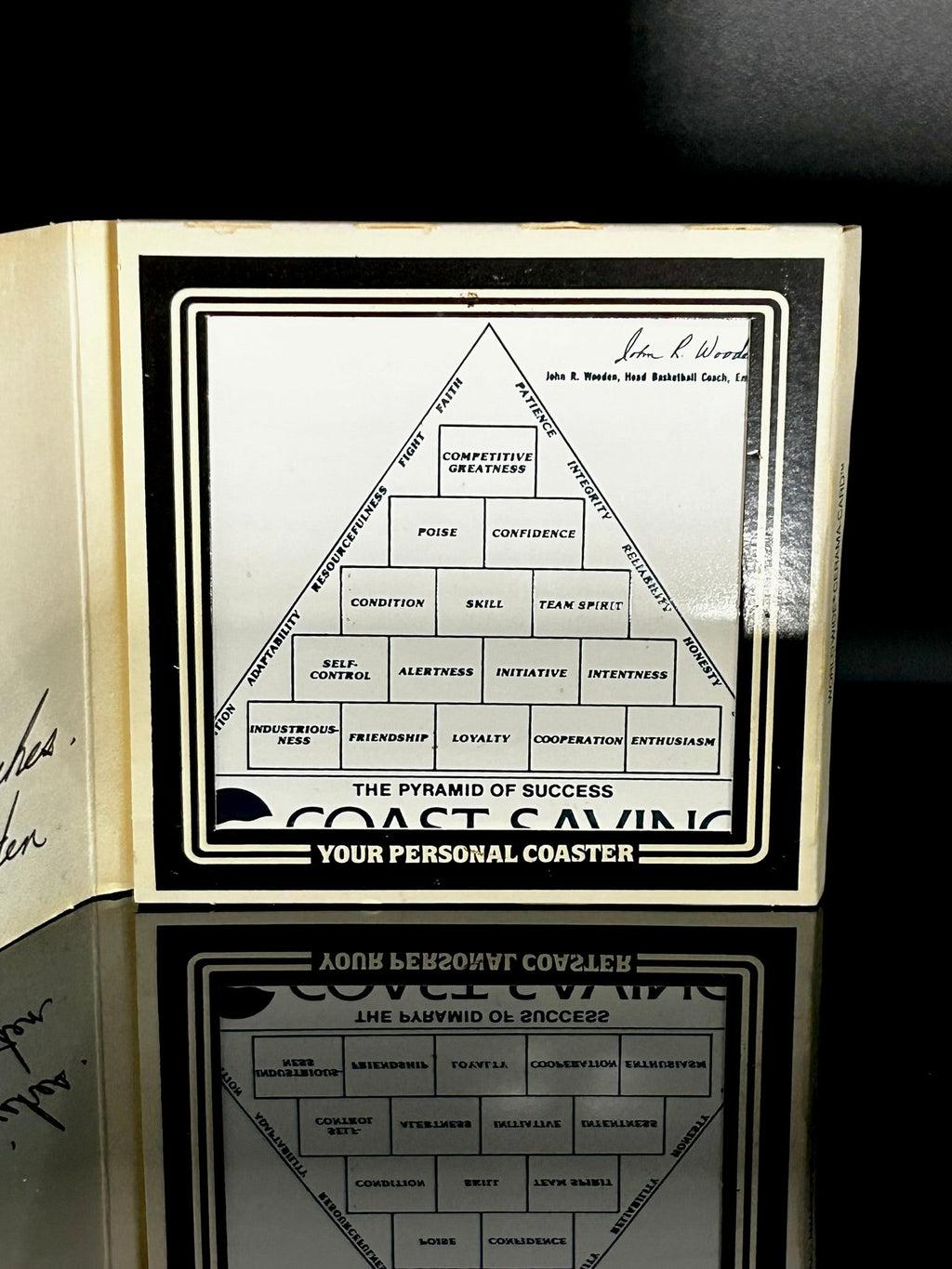 John Wooden Signed Ceramic Tile – Coast Savings "Pyramid of Success" – Authentic Autograph