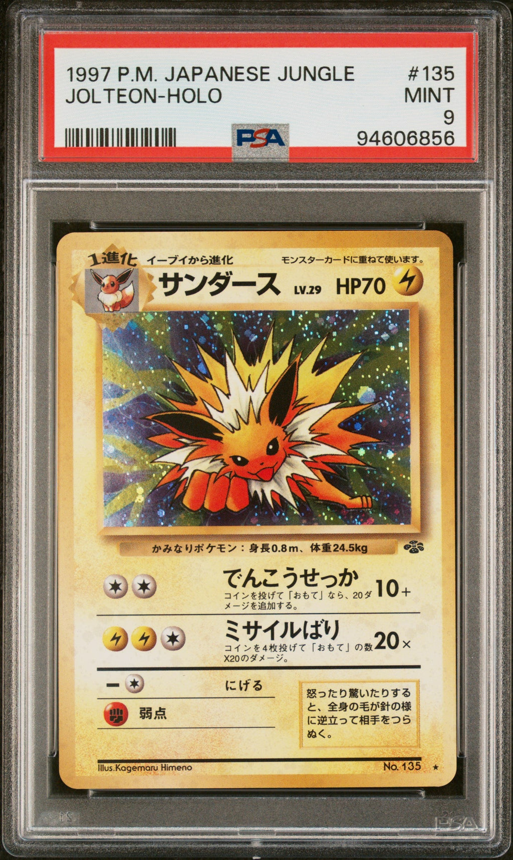 Card Number: 135 Category: Collectible Trading Cards Condition: Mint Player/Character: Jolteon-Holo Set: 1997 Pokemon Japanese Jungle Type: Collectible Card Game Year: 1997 Game: Tcg Grade: PSA 9 Certification #: 94606856