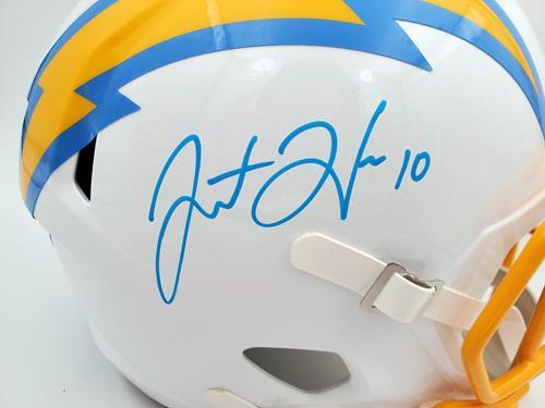 Show your support for the Los Angeles Chargers with this authentic Justin Herbert autographed replica helmet. This deluxe full-size replica helmet features the signature of the talented quarterback and comes with a Beckett certificate of authenticity for added peace of mind. Perfect for any fan or collector, this helmet is a must-have for showcasing your team spirit and love for the game.