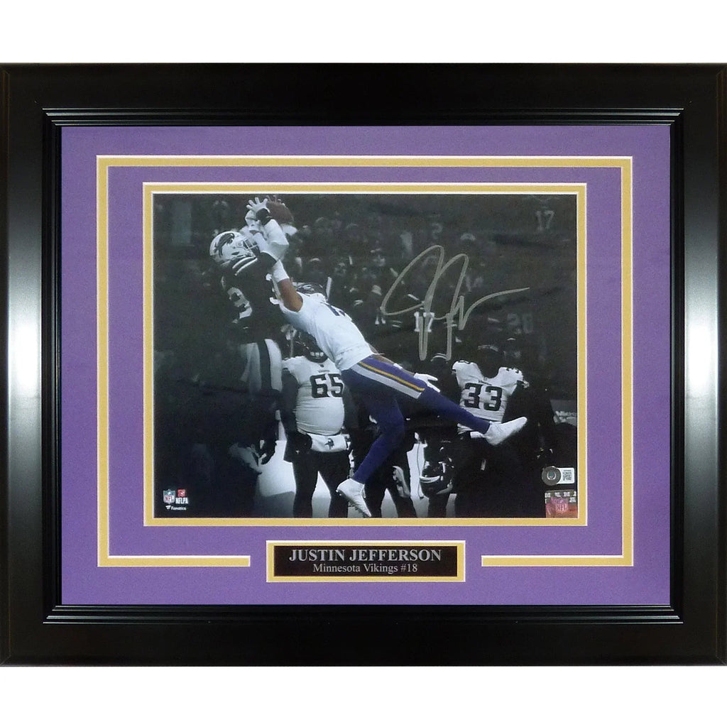 This deluxe framed photo features a stunning, autographed shot of Justin Jefferson, captured in a dramatic Spotlight Catch. A must-have for any Minnesota Vikings fan! Bring the energy and passion of the game into your home with this iconic piece!