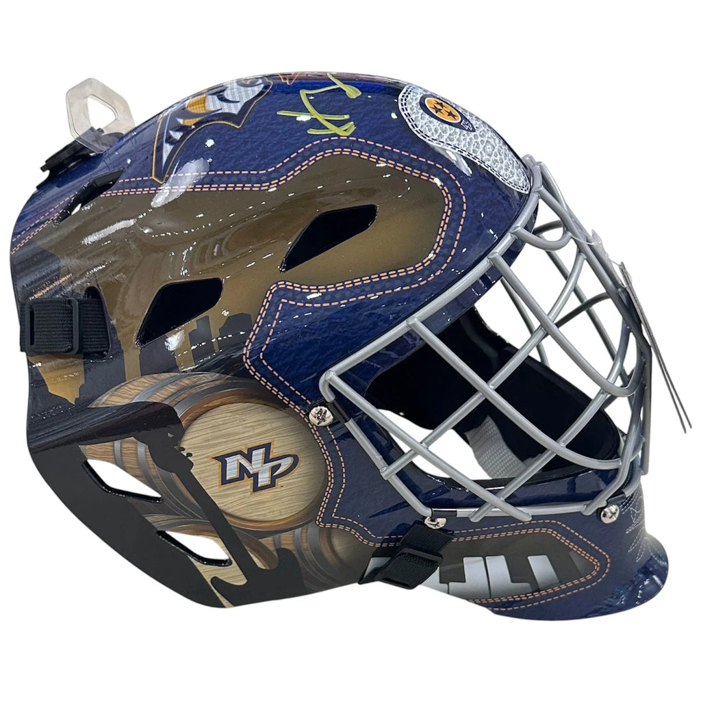 This authentic Juuse Saros autographed goalie mask is a must-have for any Nashville Predators fan! The full-size mask features Saros' signature and is certified by JSA. Protect your head while showing off your team spirit with this unique and valuable piece.