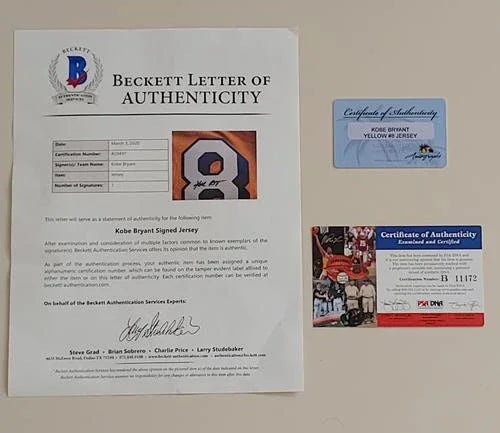 Own a piece of basketball history with this Kobe Bryant signed Los Angeles Yellow #8 custom jersey. With authentication by PSADNA and Beckett Letter, this jersey is a must-have for all Kobe fans and collectors. Show your love and admiration for the legendary player with this truly iconic item. This jersey was hand signed by Los Angeles Lakers star Kobe Bryant at a private signing. A tamper-evident hologram will be affixed to the item.