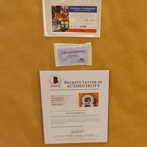 Own a piece of history with this authentic Kobe Bryant autographed Los Angeles Yellow #8 deluxe framed jersey. Certified by PSADNA and Beckett Letter, this jersey is not only a collector's item but also a testament to Bryant's legendary career. Hang it in your home or office and inspire greatness every day. The total frame dimensions measure 44 x 36.