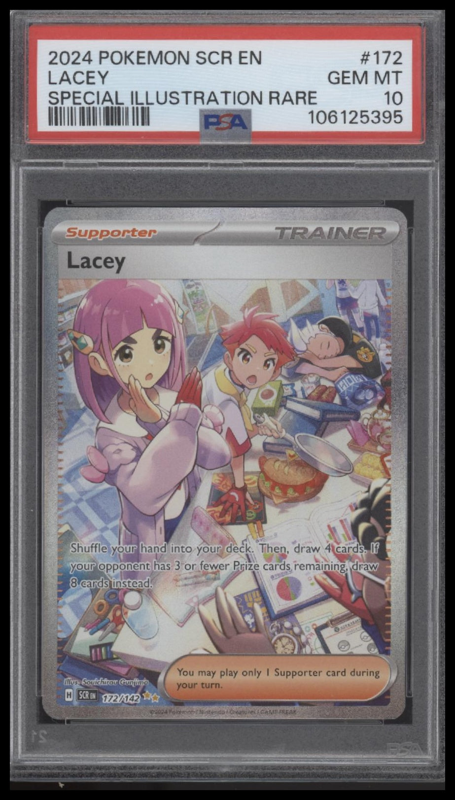 Card Number: 172 Category: Collectible Trading Cards Condition: Gem Mint Player/Character: Lacey Set: 2024 Pokemon Scr En-Stellar Crown Type: Collectible Card Game Year: 2024 Game: Tcg Grade: PSA 10 Certification #: 106125395