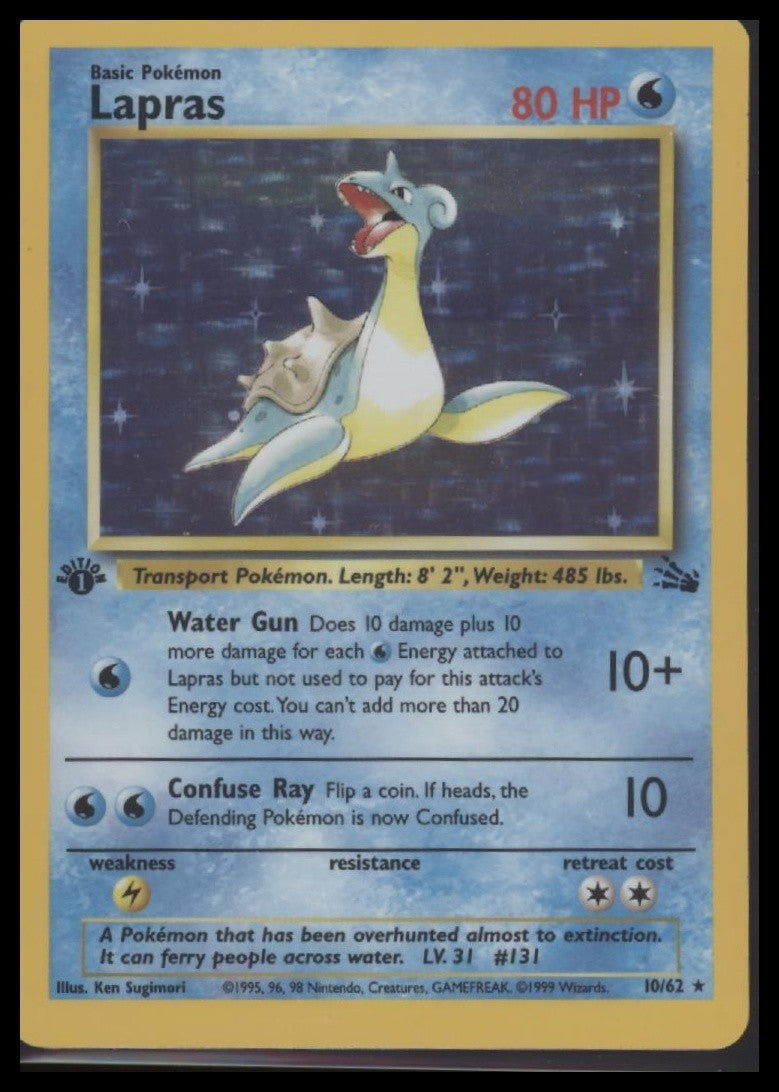 Card Number: 10/62 Category: 183454 Category: Collectible Trading Cards Condition: Lightly played Game: Pokemon Player/Character: Lapras (10) Rarity: Holo Rare Set: Fossil Type: Collectible Card Game Year: 1999