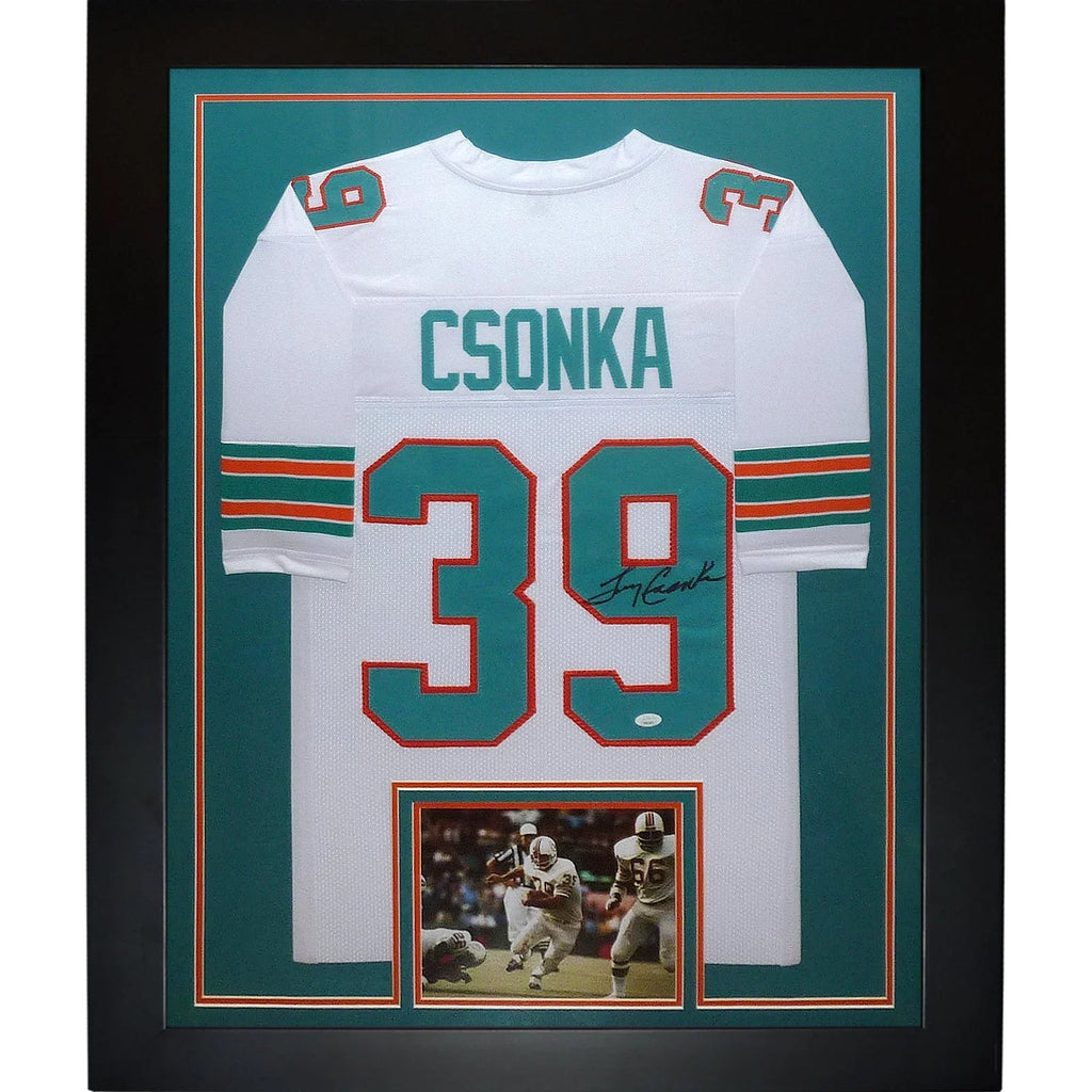 Own a piece of NFL history with this Larry Csonka autographed Miami Dolphins White #39 framed jersey. Certified by JSA, this collectible showcases the legendary player's signature and will be a cherished addition to any fan's collection. Show your love for the game and the player who made it great. Celebrate the legacy of one of the greatest NFL players, Larry Csonka, with this certified autographed jersey. Displaying his signature, this collectible piece is sure to be treasured by any fan and is a must-have for any avid collector of the game. Own a piece of history and immortalize the legend in your own home.