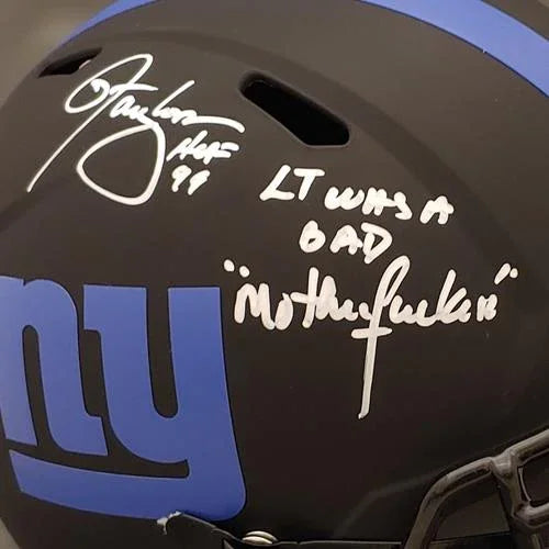 Feel the power on the field with this official Lawrence Taylor Autographed New York Giants Deluxe Full-Size Replica Helmet. Showcasing the iconic Eclipse Alternate design, it comes with the exclusive "LT was a Bad M* F*" inscription for added impact. Authenticated by Beckett Witness, this helmet is a must-have for any passionate fan!