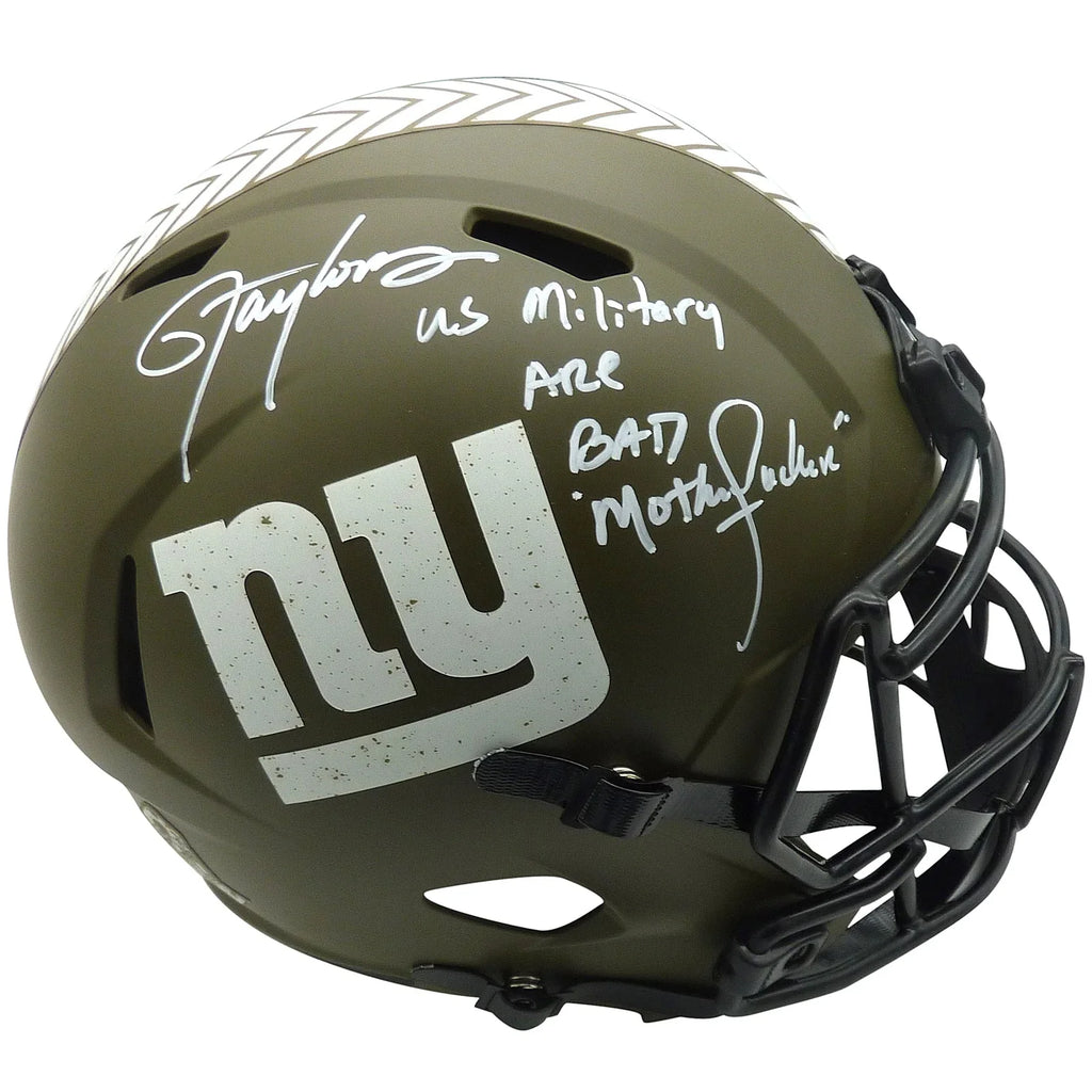 Show your support and appreciation for the military with this Lawrence Taylor autographed New York Giants full-size replica helmet. This deluxe helmet features a military inscription and has been certified by BAS. A must-have for any Giants fan and a perfect way to honor a legendary player.