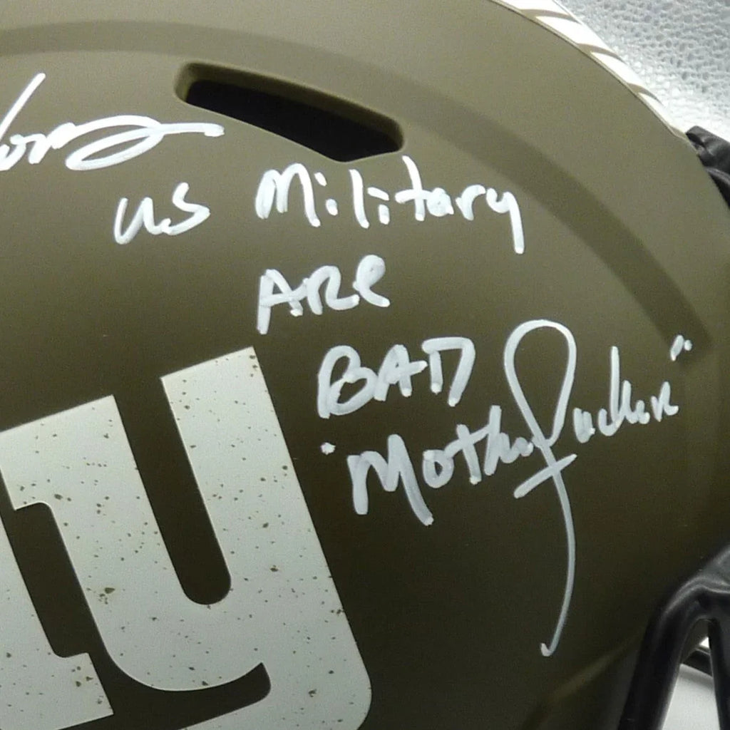 This helmet was hand signed by Hall of Famer Lawrence Taylor at a private signing. He added the rare inscription : US Military are Bad Mother F***ers. It is accompanied by a Certificate of Authenticity from Beckett. A tamper-evident hologram will be affixed to the item.