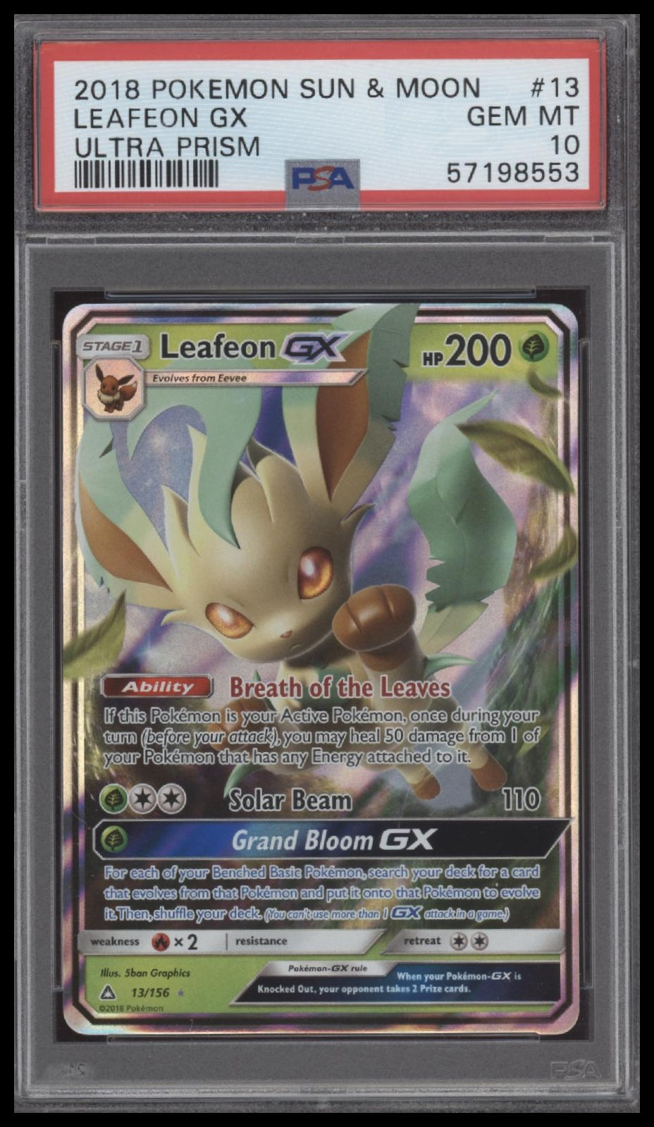 Card Number: 13 Category: Collectible Trading Cards Condition: Gem Mint Player/Character: Leafeon Gx Set: 2018 Pokemon Sun & Moon Ultra Prism Type: Collectible Card Game Year: 2018 Game: Tcg Grade: PSA 10 Certification #: 57198553