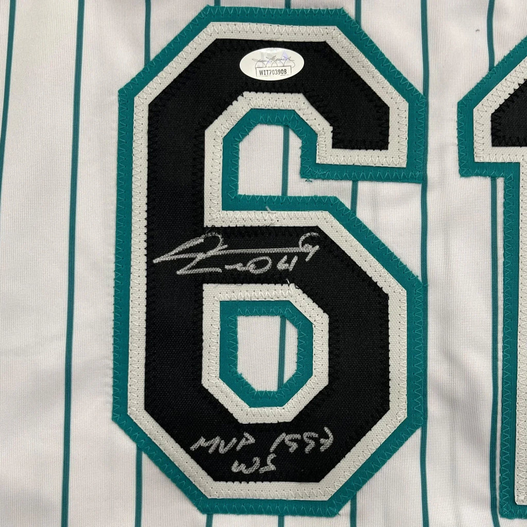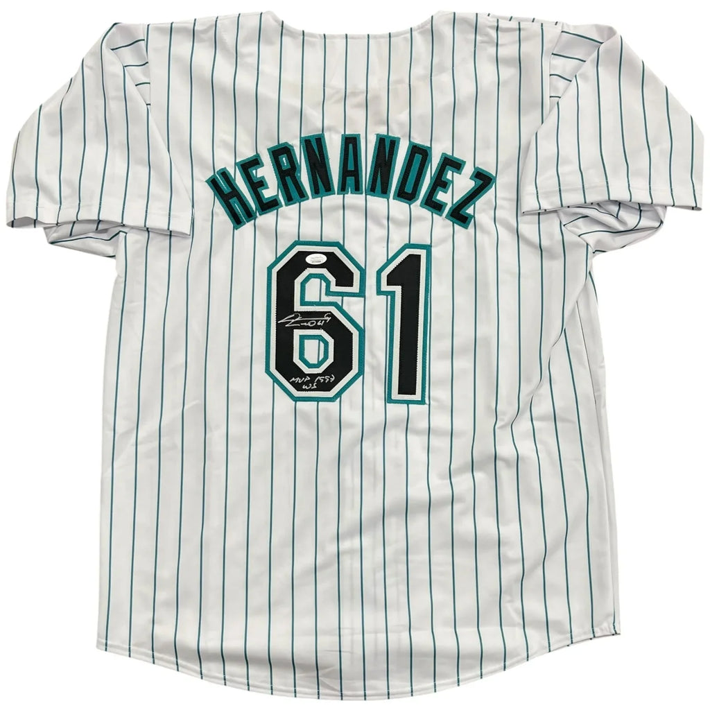 Score a home run with this custom Livan Hernandez autographed Florida Marlins jersey! With the added "MVP 1997 WS" inscription and JSA authentication, this pinstripe jersey is the perfect addition to any baseball fan's collection. Show off your love for the game with this unique piece.