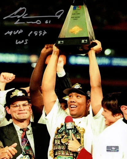 Showcase your love for the Florida Marlins with this Livan Hernandez autographed 8x10 photo featuring the iconic World Series trophy. As the MVP of the 1997 WS, Hernandez's signature adds value to this one-of-a-kind collectible. Perfect for die-hard fans or avid collectors alike.