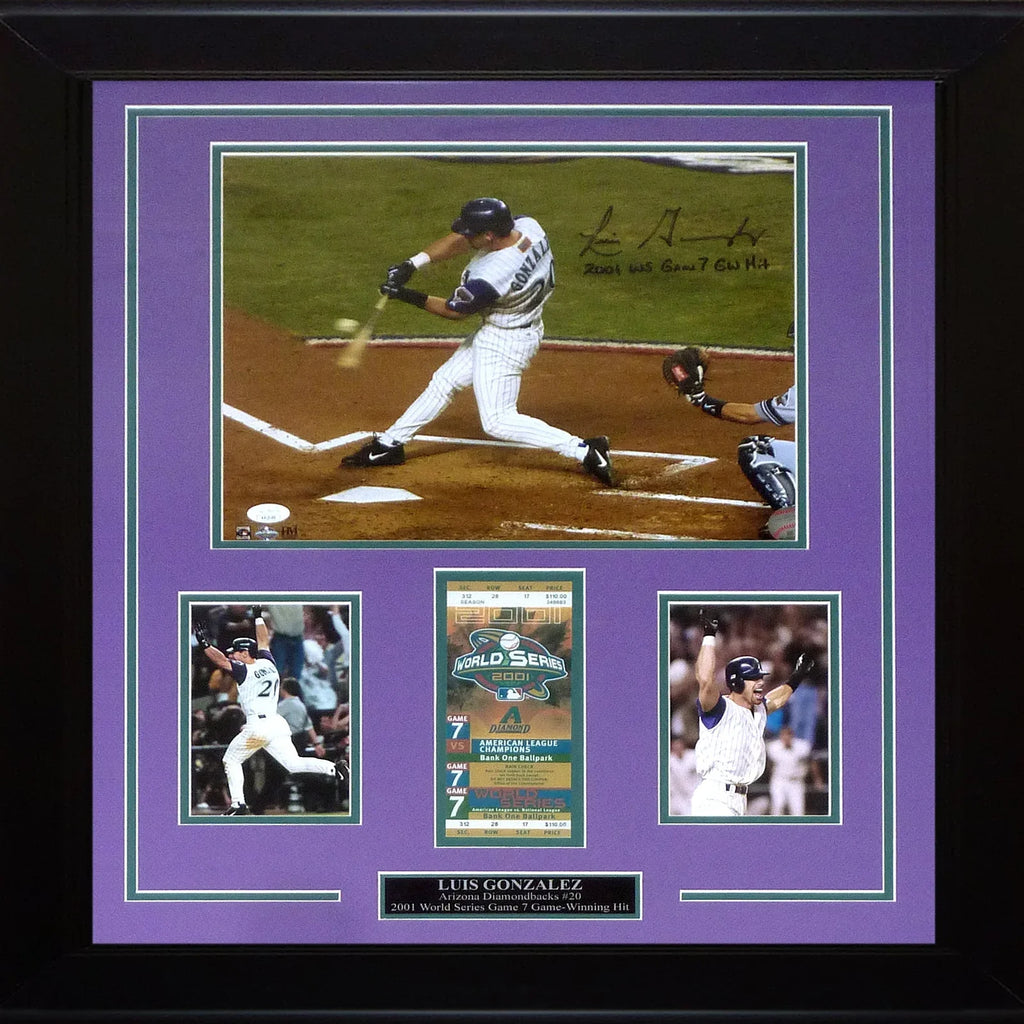 Celebrate the iconic 2001 World Series hit with this deluxe framed 11x14 photo of Luis Gonzalez, autographed and accompanied by a replica World Series ticket. A must-have for any Arizona Diamondbacks fan, this piece captures the thrill and triumph of one of the most memorable moments in baseball history. Own a piece of history today!