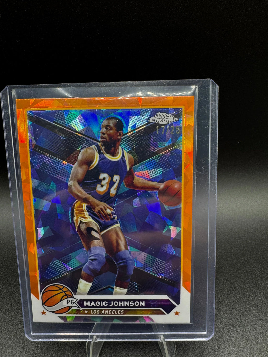 This limited-edition Magic Johnson card from the 2023-24 Topps Chrome series features a striking True Orange foil finish and is numbered 17 of only 25 produced. Celebrating the Hall of Famer’s legendary career with the Los Angeles Lakers, this rare parallel offers collectors a premium, highly sought-after piece that combines vibrant aesthetics with exceptional scarcity. Ideal for serious collectors aiming to enhance their basketball card portfolio with a standout, low-print-run gem.
