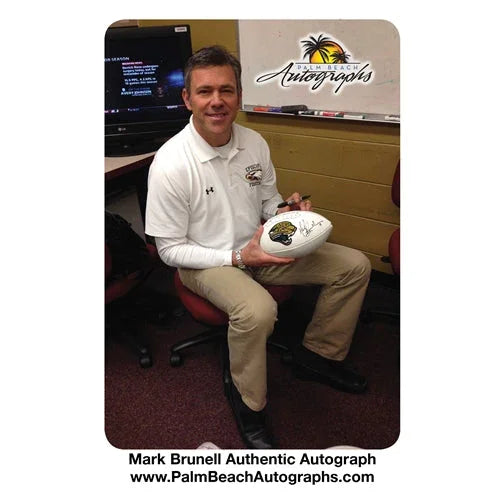 Elevate your collection with this Mark Brunell autographed Jacksonville Jaguars logo football. Show off your team spirit with this unique piece signed by the legendary quarterback. Guaranteed to bring highly valued memories and spark conversation. Don't miss out on owning a piece of history, get yours now! Each signature is witnessed by a member of our staff or comes out of a private signing.
