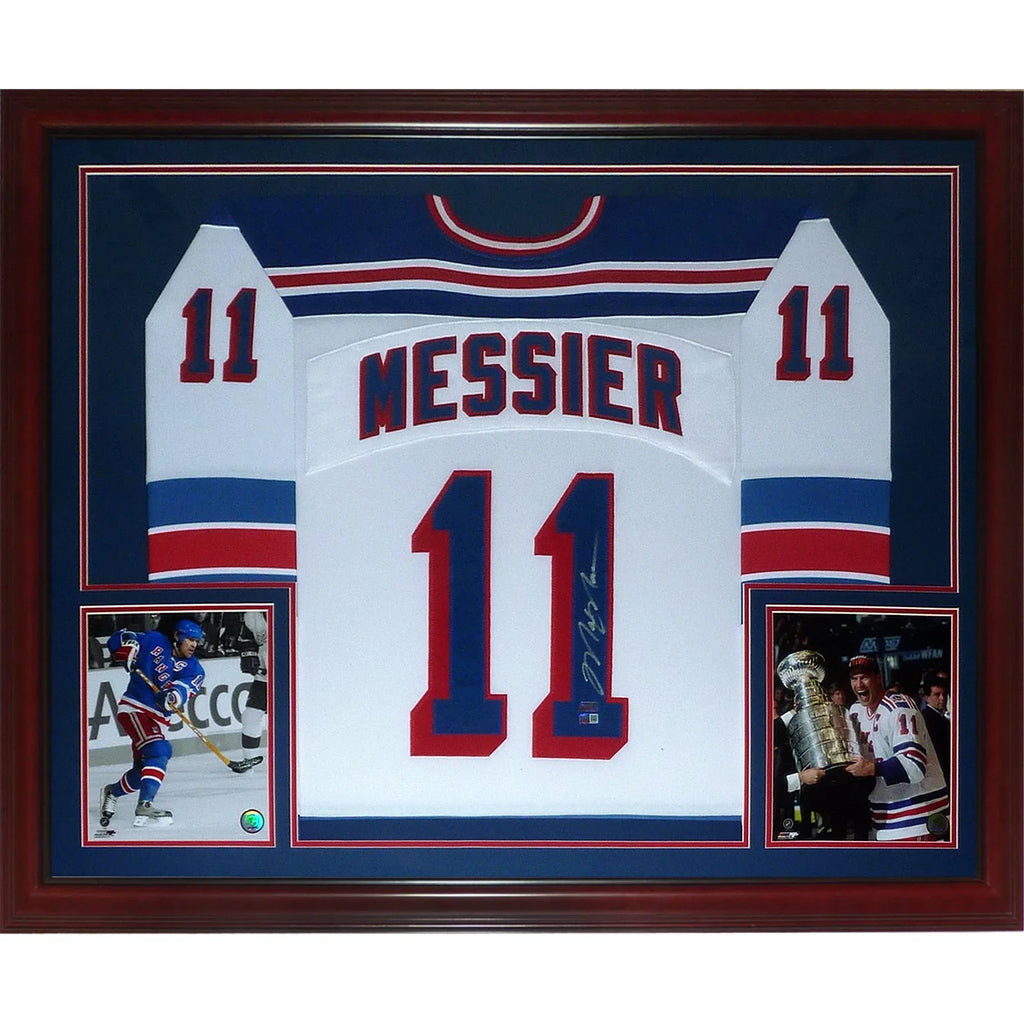 This Mark Messier Autographed New York Rangers deluxe framed jersey is a must-have for any passionate hockey fan! The white #11 jersey is authentically signed by the legendary Mark Messier and comes with a JSA certificate of authenticity. Show your love for the game with this inspiring and prestigious piece.