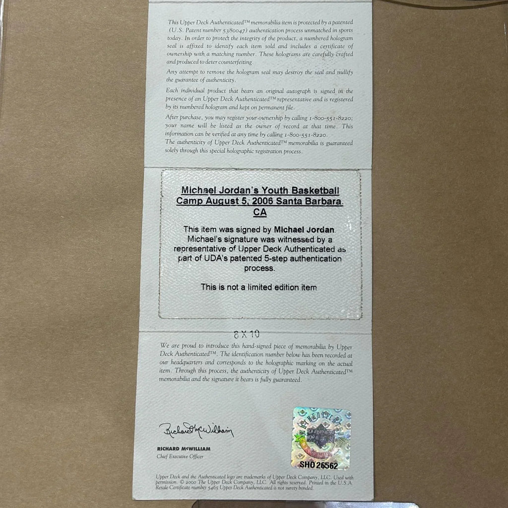 Experience the thrill of owning an authentic piece of basketball history with this deluxe framed 8x10 photo, showcasing the legendary Michael Jordan's autograph. Professionally crafted by UDA Upper Deck, this is the perfect addition to your home or office decor, solidifying your status as a true fan. Don't miss out on this must-have item!