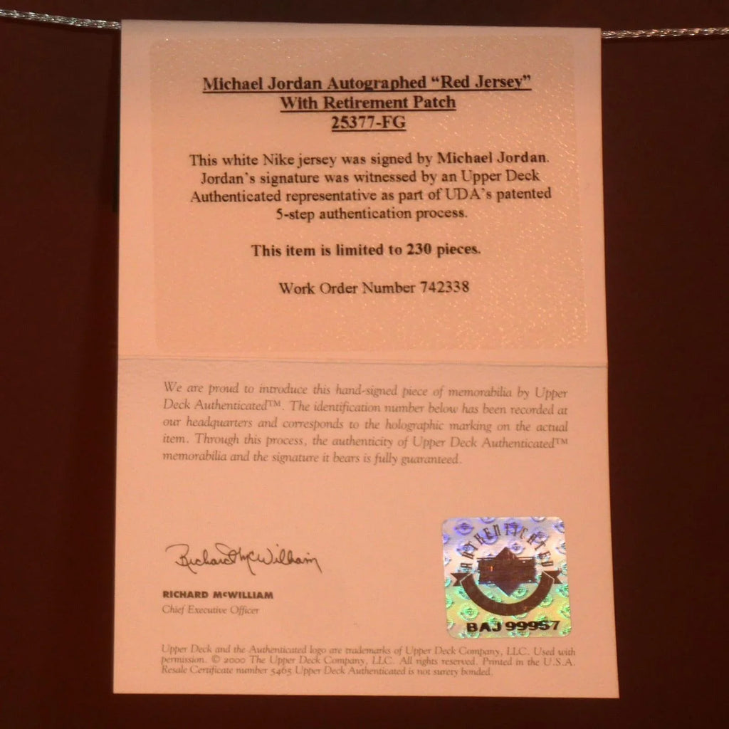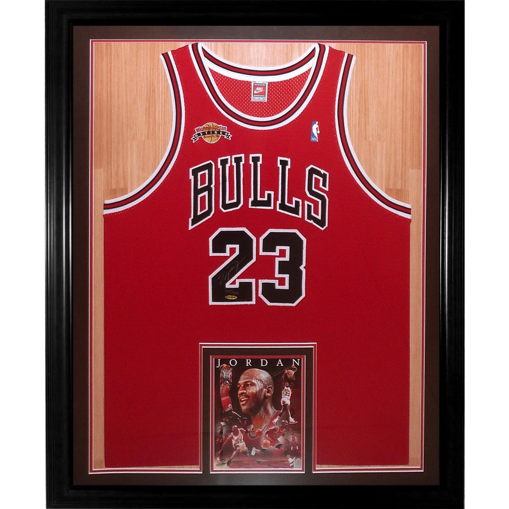 Experience the ultimate collector's item with this limited-edition 207 out of 230 Michael Jordan autographed Chicago Bulls jersey. This deluxe framed jersey features the iconic red #23, a Mitchell & Ness retirement patch, and comes with a certificate of authenticity from Upper Deck! Own a piece of basketball history with this highly coveted item.