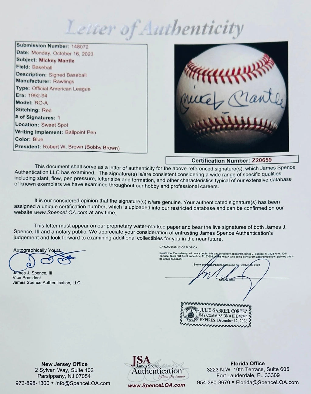 This Mickey Mantle Autographed Official AL Baseball is a must-have for any baseball fan. With a JSA certification, you can be confident in its authenticity. Add this piece of sports history to your collection and relive the greatness of Mickey Mantle every time you see it.