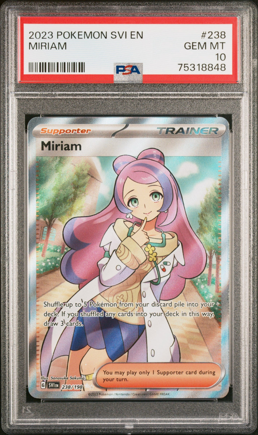Card Number: 238 Category: Collectible Trading Cards Condition: Gem Mint Player/Character: Miriam Set: 2023 Pokemon Svi En-Scarlet & Violet Type: Collectible Card Game Year: 2023 Game: Tcg Grade: PSA 10 Certification #: 75318848