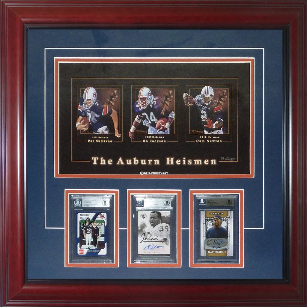 Own a piece of history with this deluxe framed triple card frame featuring autographs from Pat Sullivan, Bo Jackson, and Cam Newton, all Heisman winners from Auburn University. Each card comes authenticated by Beckett and beautifully displayed in a sleek frame. Perfect for any die-hard Tigers fan!