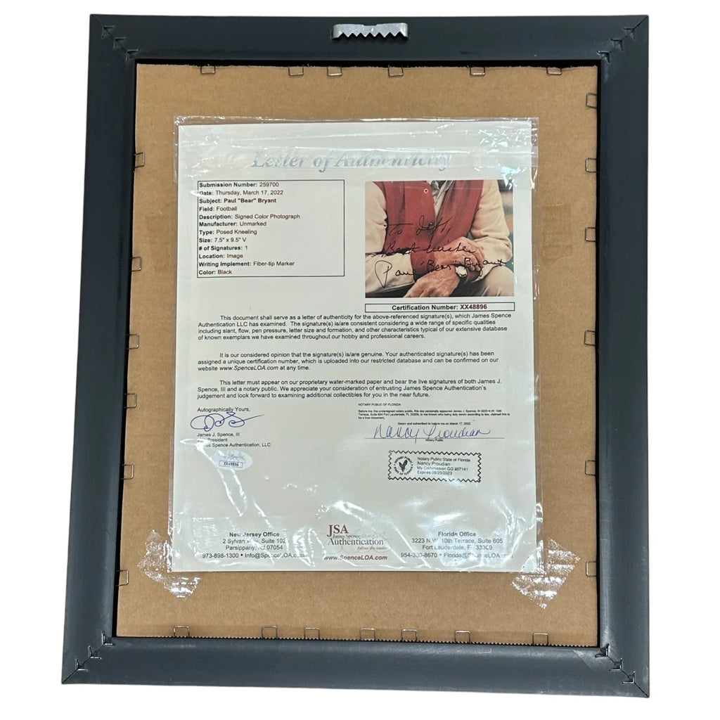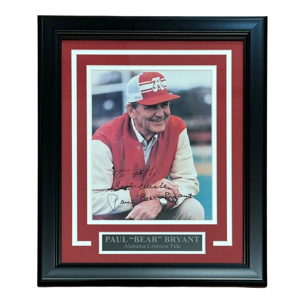 Add a touch of history to your collection with this Paul "Bear" Bryant autographed Alabama Crimson Tide deluxe framed photo. Perfect for any sports fan, this authenticated piece showcases the legendary coach's signature in a beautiful display. Own a piece of football history with this one-of-a-kind item.