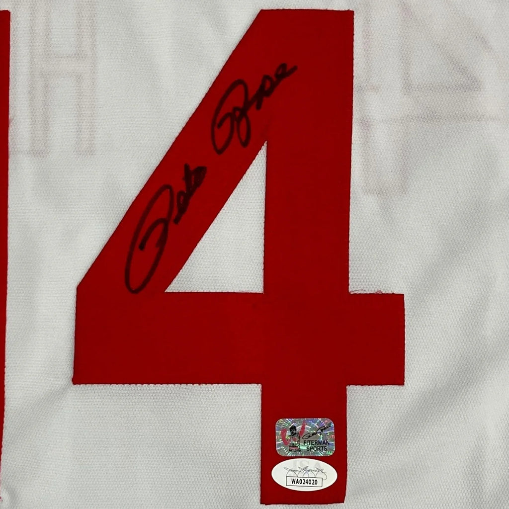 Own a piece of baseball history with this Pete Rose autographed Cincinnati (White #14) custom jersey, authenticated by JSA. Show off your team pride with this unique and valuable collector's item signed by the legendary player himself. A must-have for any fan or collector.