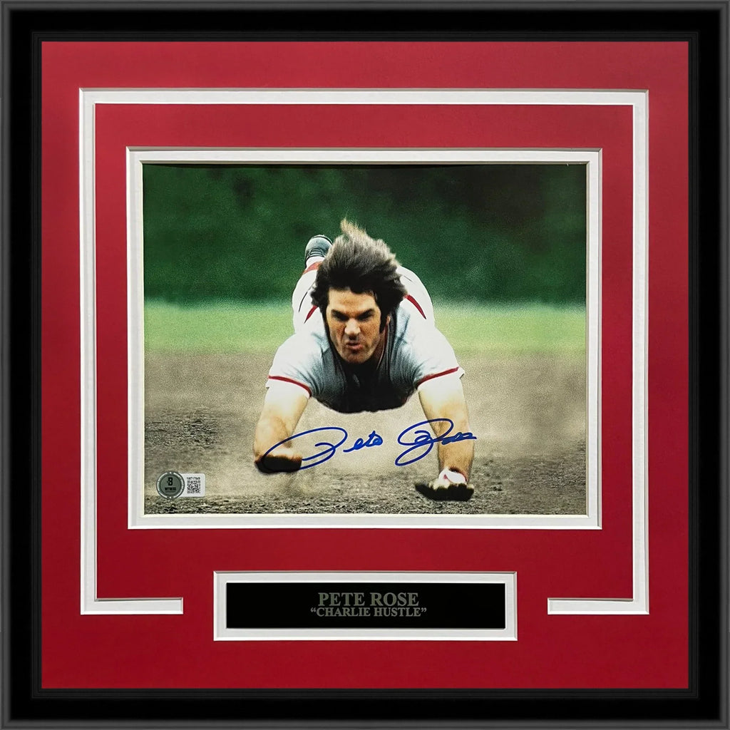 Capture the thrill of the game with this deluxe framed 8x10 photo of Pete Rose in his iconic "Head First Slide" moment. Personally autographed by baseball legend Pete Rose himself, this piece comes with a JSA certification for added authenticity. Perfect for any Cincinnati Reds fan or sports memorabilia collector!