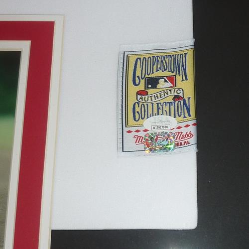 This Cincinnati Reds Mitchell and Ness jersey was hand signed by Hit King Pete Rose at a private signing. It is accompanied by a Certificate of Authenticity from Palm Beach Autographs and JSA. A tamper-evident hologram will be affixed to the item. Each signature is witnessed by a member of our staff or comes out of a private signing. This jersey has been professionally framed in a rich cherry wood frame (also available in black by request) with custom double matting in team colors along with 2 action photos. The total frame dimensions measure 44 x 36
