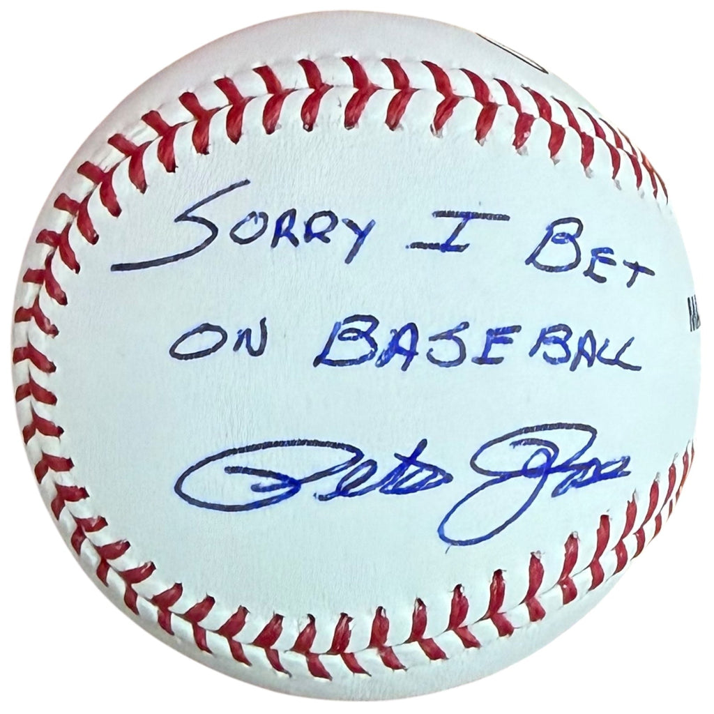 Own a piece of baseball history with this authentic Pete Rose autographed official MLB baseball. Complete with the infamous inscription "Sorry I Bet On Baseball", this ball is a must-have for any passionate fan or collector. Don't miss your chance to own a piece of history!