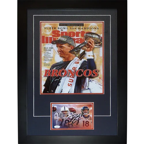 Own a piece of NFL history with this autographed Peyton Manning deluxe framed photo! This 11x14 cover of Super Bowl SI features Manning's signature and is authenticated by JSA. Perfect for any Broncos fan, this framed photo is a must-have for any sports memorabilia collector.