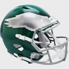 Philadelphia Eagles Full Size Speed Replica NFL Helmet by Riddell. This full size Eagles helmet is designed with a non-wear plate and molded foam jaw pads. a steel polyvinyl-coated face mask, 4-pt chin strap, and elliptical air vents. NFL Team name on back bumper (except Chiefs, Steelers and Giants). The officially licensed NFL helmet is great for autographs and features Eagles team logo decals on both sides. The striking shape of the future. NFL Eagles Replica Speed helmet size medium measures: 12.75"(L), 9.25"(W), 9.75"(H). NFL Philadelphia Eagles Full Size Speed Replica Helmet. (NOT FOR WEARING)