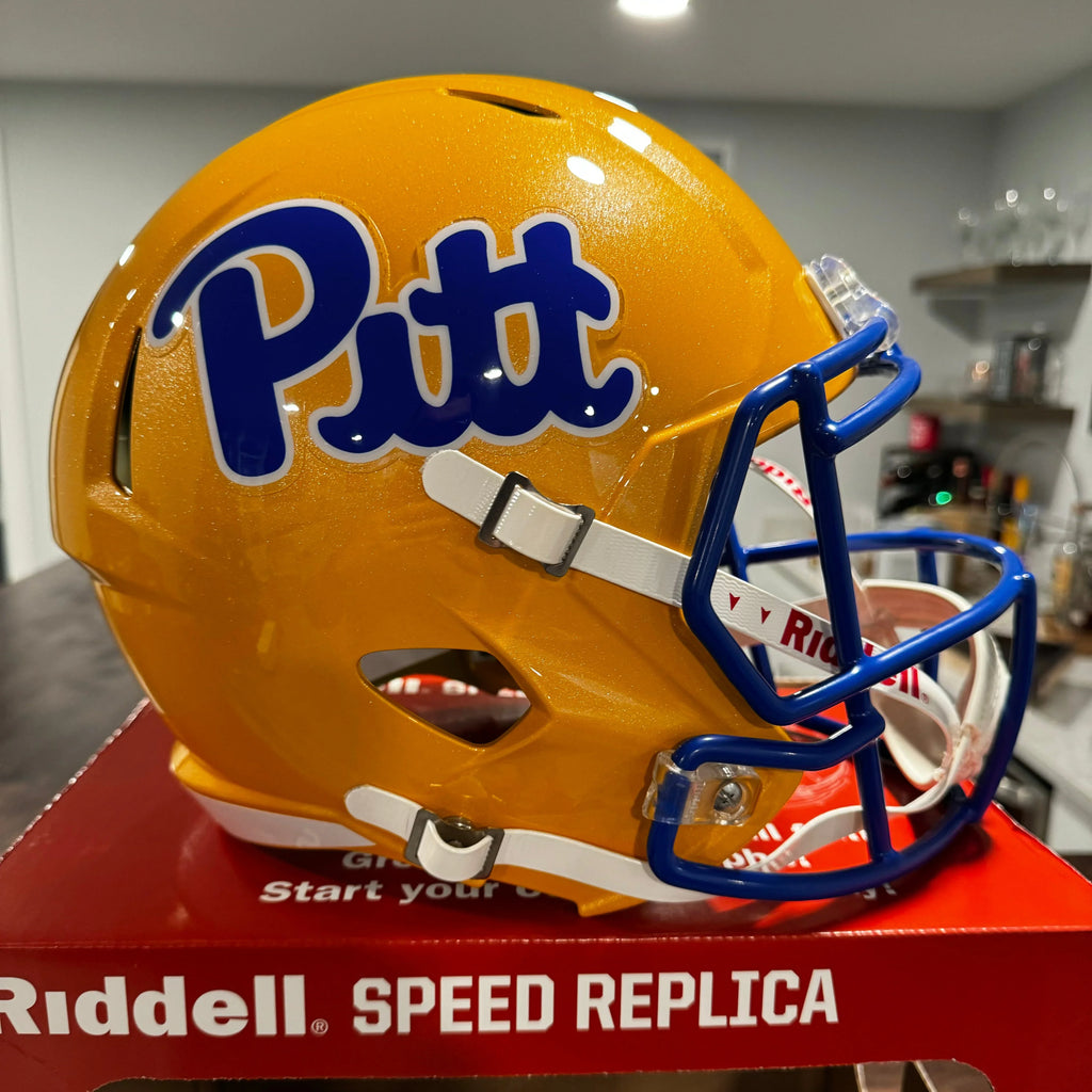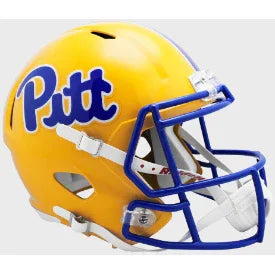 Pittsburgh Panthers Full Size Speed Replica NCAA Helmet by Riddell. This full size Pittsburgh helmet is designed with a non-wear plate and molded foam jaw pads. a steel polyvinyl-coated face mask, 4-pt chin strap, and elliptical air vents. This officially licensed NCAA helmet is great for autographs and features Pittsburgh team logo decals on both sides. The striking shape of the future. NCAA Pittsburgh Replica Speed helmet size medium measures: 12.75"(L), 9.25"(W), 9.75"(H). NCAA Pittsburgh Panthers Full Size Speed Replica Helmet. (NOT FOR WEARING